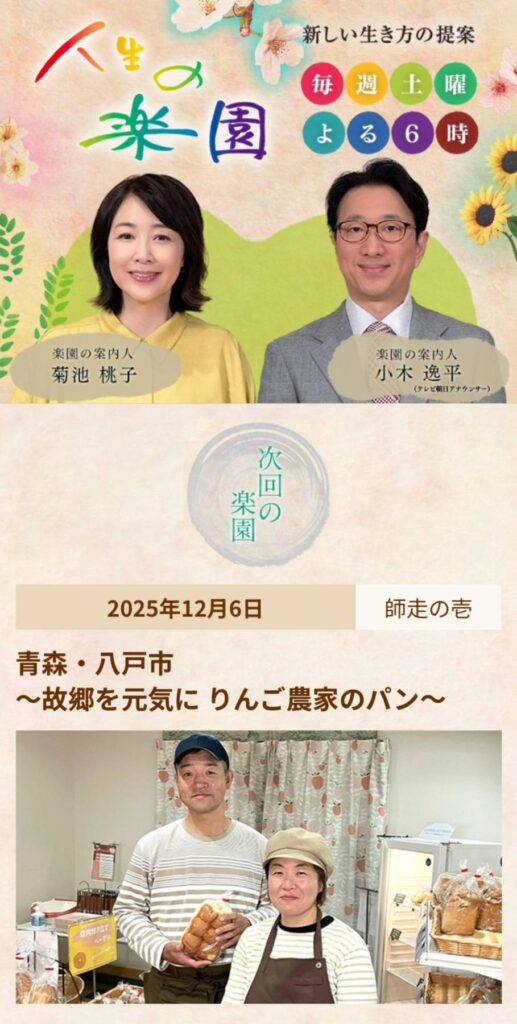 2月6日午後6時からテレビ朝日系列『人生の楽園 』で、館鼻岸壁朝市の出店者の〈森のおかしやさん〉岩織さんのお店〈森パン〉が取り上げられ放送されます。